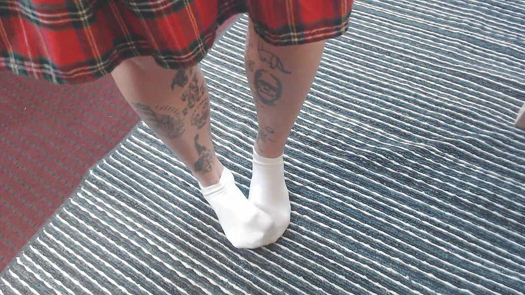 Standing and a nice long view of my cute white clean ankle socks. Toe wiggling and lifting. 360' view and in the end I kick them off.