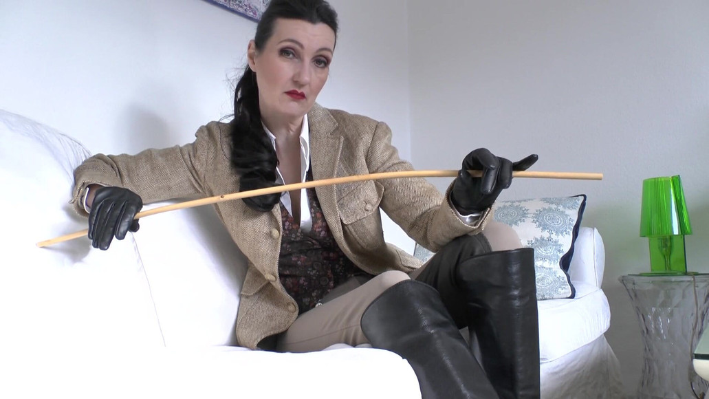 I greet you today in a classic equestrian outfit. I'm putting on my leather gloves now. You can start polishing my boot soles. With your tongue, of course! I notice you're always licking the same spot and staring at me! You're supposed to clean my soles all over, not just in one place! I take my cane in my hand and tap my boot. What's wrong with you? It's been too long since I punished you severely! It's quite obvious! Keep licking, clean my soles, I'll check afterward! During the inspection, I find that you've done better than this. Now you go over to the other room. Put on leather arm cuffs and stand in front of the cross and wait for me. I'll be right there, and then I'll make my cane dance on your bottom! That's sorely needed!