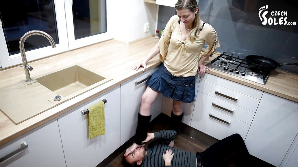 Nela and Charlie are newlyweds and they live together a happy life. Charlie loves feet and especially his wife's sexy feet and huge big toe and her soles. She is cooking dinner right now while Charlie comes and immediately starts to give attention to her feet. They look so nice and hot today, he just can't control himself and he drops on the floor right next to them and starts to worship these sexy feet. The wife is enjoying it while cooking but she want's to get more out of it so she asks for a foot massage and back massage and she controls her husband by telling him what he should do with her feet. These two were made for each other.