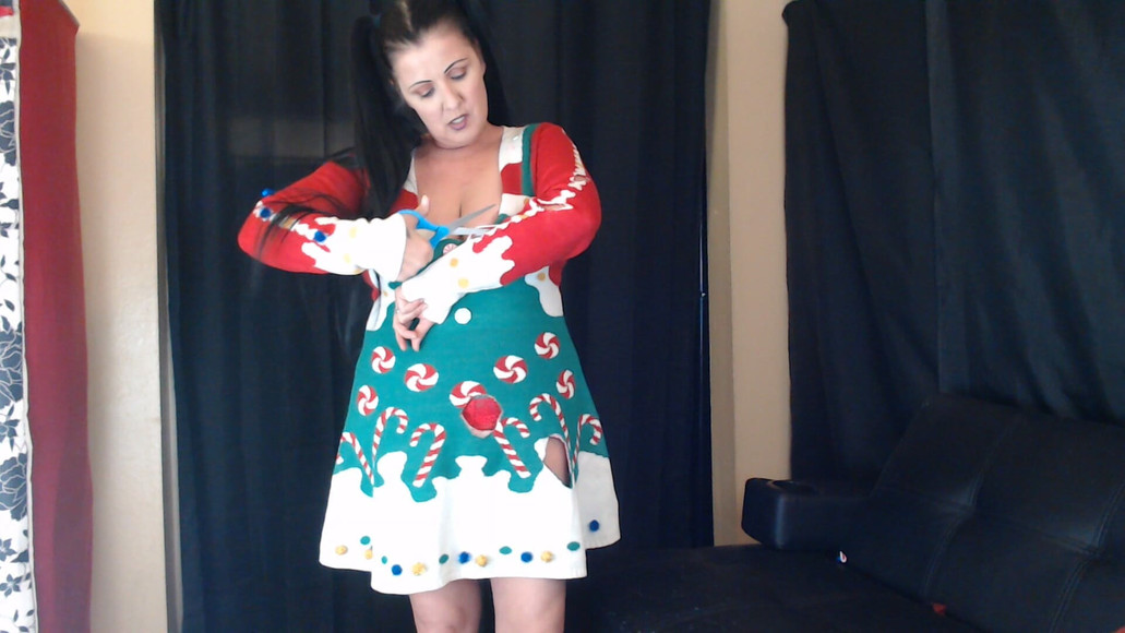 Time to get rid of my Christmas dress. It is super cute, mrs clause Esque. Very sexy. But no need in these hot humid summers. I cut it through and through, making holes in every place. Big tits are out and red lace thongs watch.