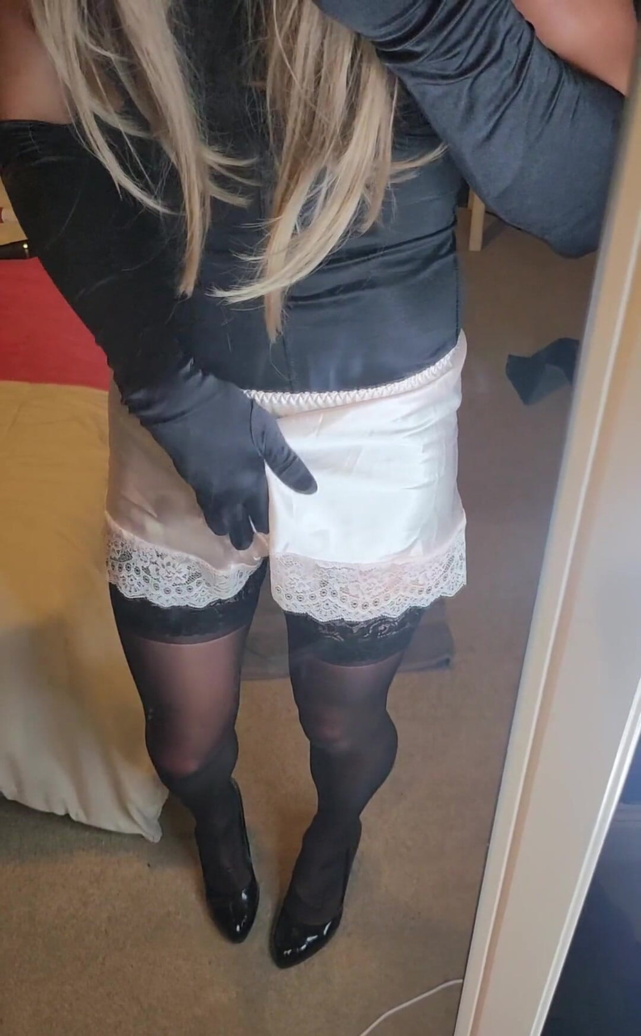 Dětské růžové saténové francouzské kalhotky a černé spodní prádlo