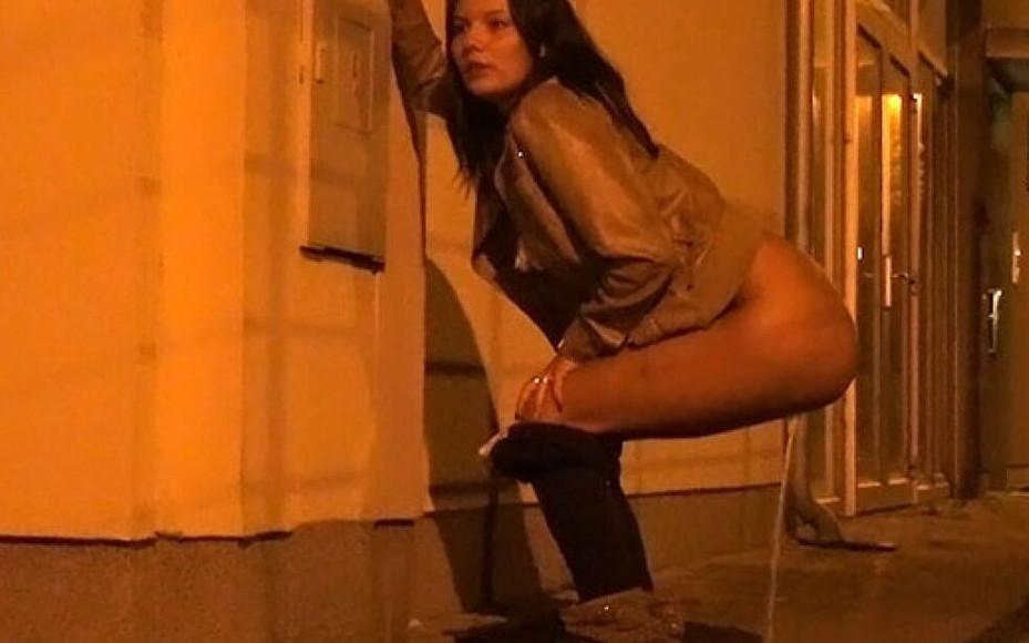 Got2Pee presents "Orange" - part of the Puffy Network. At night a gorgeous babe walks through the city and needs to pee before she gets home. She pulls down her trousers and bends over, crouching as she holds onto a ledge letting her golden pee drench the concrete floor below.