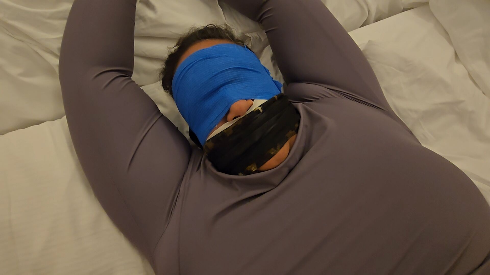 Monday morning and Hubby is filming me getting my stockings on for work and walking around with a Hard on, so I slip into a Satin top, Satin Mini Skirt and Heels, I cant resist sucking his cock and leave him on edge before I leave. After work Hubby gets his own back, he gags and Blindfolds me with wrapping Satin Scarves around my mouth and head before tying me to the bed, he eats my pussy to get me going and the ties the magic wand to my pussy and watches me Orgasm time after time for over 5 minutes. He then Fucks me hard POV my tits bouncing in my satin top till he cream pies me
