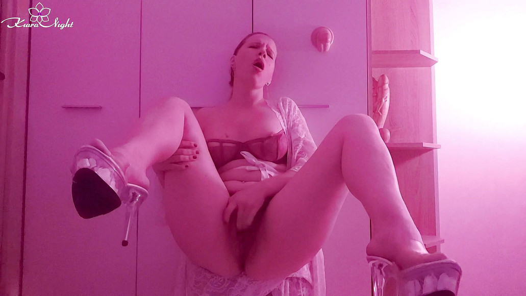Slim girl jerks off her tight pussy and sucks a huge dildo in pink light