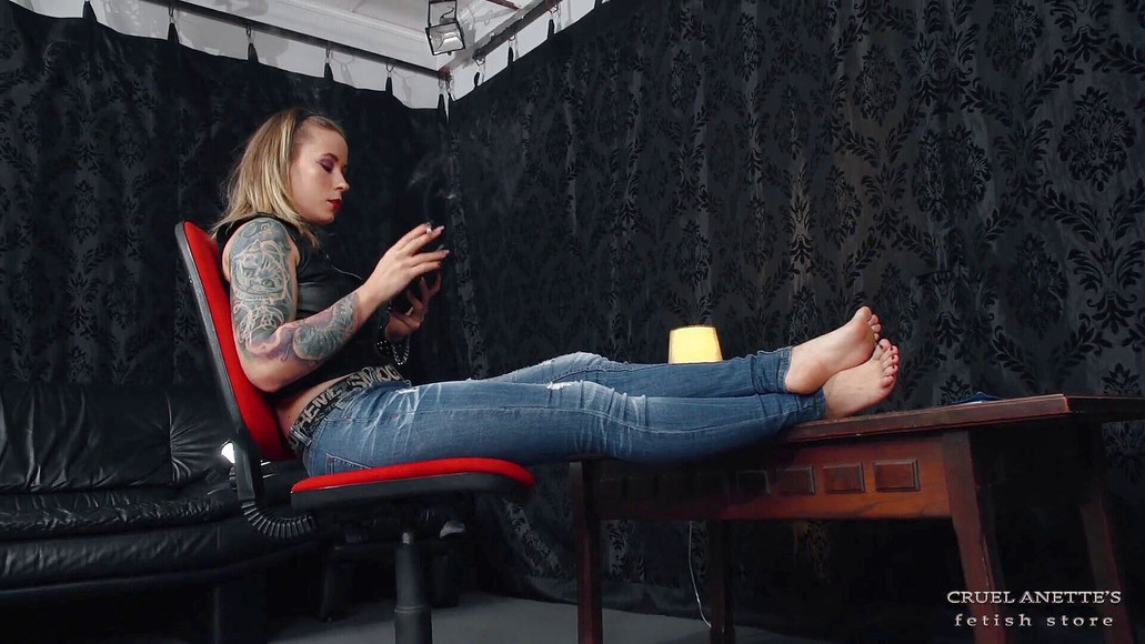 Her legs are a bit tired, so it's a pretty nice feeling to have them both up on the small table. Mistress Anette is texting on her phone and she instantly desires a nice cigarette too, so she sits there with her naked feet up on the table with a cigarette in hand.