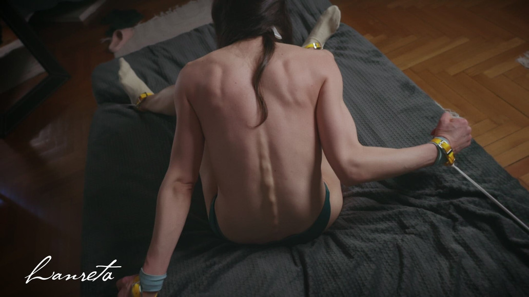 I am tied to the bed again with my hands and feet, topless. Without stopping, I strain the muscles of my entire body and try to break free.