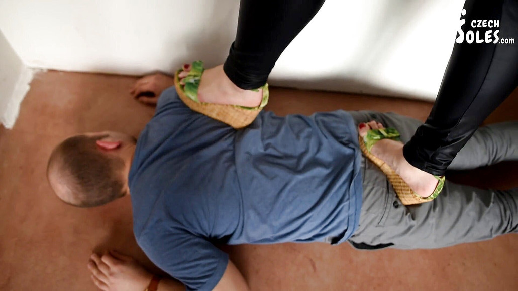 Trampling, foot slapping, foot domination, foot in mouth and all kinds of foot worship - all that is what gets Patrik going. He likes mean girls who want to punish him up, and put their feet in his face with smile on their faces. He is a great match with Madam Cat, who makes living as a Dominatrix here in Czech Republic and who loves to humiliate men, show them where their place is, at her feet, under the bottom of her shoes and on their knees before her begging for mercy. Let's see what Patrik can take - Madam Cat has over 72 kilograms of weight and she's wearing high heel platforms today on her sexy big feet. Patrik likes trampling but this is too much for him. Cat has to take her shoes off in order not to squeeze live out of Patrik while she's standing on him and trampling him all over. She really enjoys this role of a mean bitch. When she slaps Patrik with her feet, she has this smile on her face and you can say it's not fake one