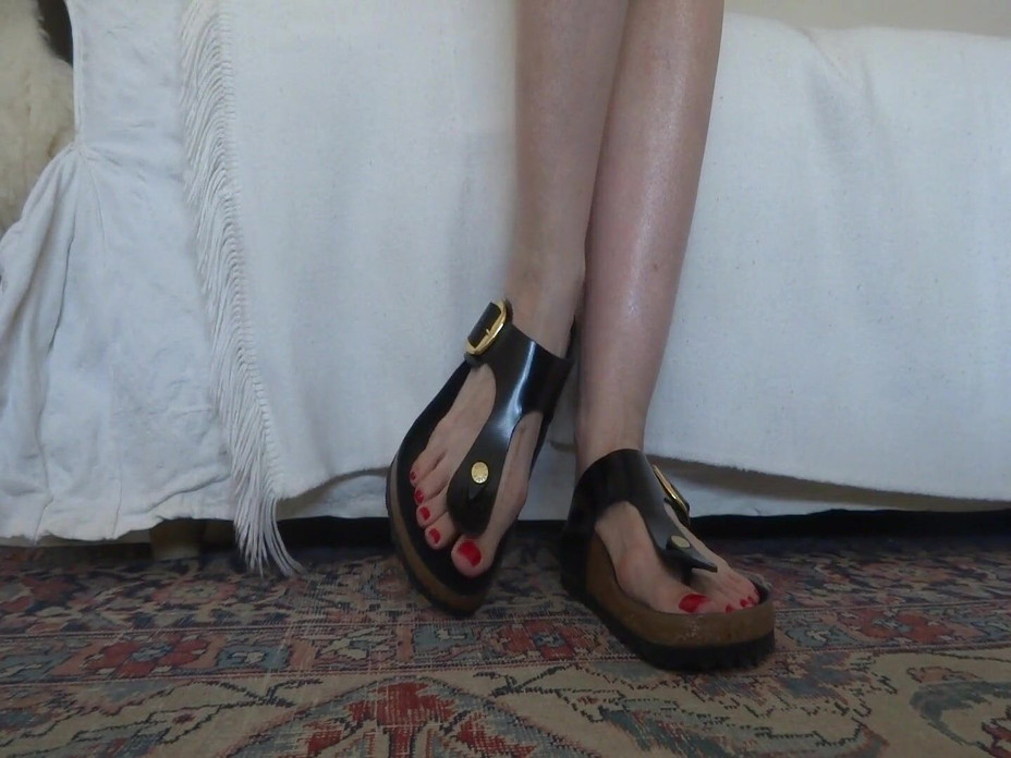 Today I'm wearing flat slippers. I always slip into the slippers because I like the feeling. I wiggle my toes sometimes. I show you my soles and my feet in the slippers. A feet and slippers show for lovers.