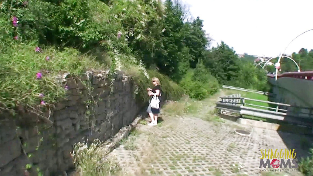 Blonde mature bitch wearing high heels blowing cock and getting pounded outdoors where cum spills on her tits.