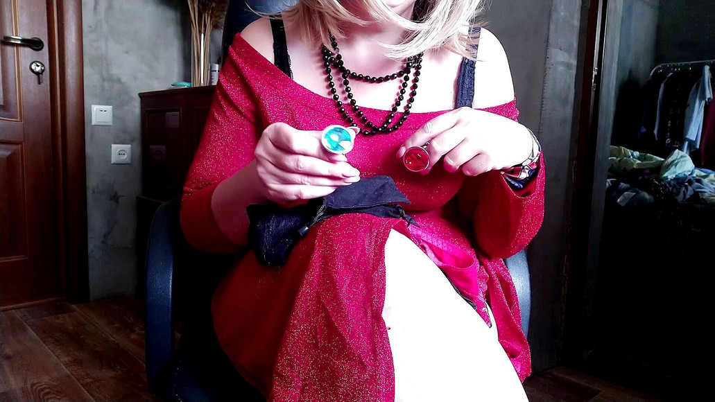 Russian MILF is sitting in a chair, she shows her panties and two steel anal plugs. Having chosen one of the plugs, the milf turns her huge ass towards the camera and inserts the anal plug. With two hands, a Russian voluptuous beauty spreads her buttocks and shows her big ass with a butt plug, then the milf takes off her panties and shows her ass again now in panties.