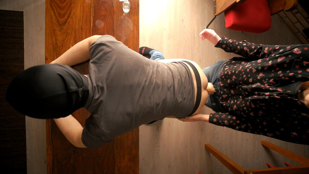 No-merci. That's the keyword for Bunny when she dresses her harness and sticks a dildo into her submissive sissy hubby's butt hole. She push him over the kitchen desk and screw him deeply.