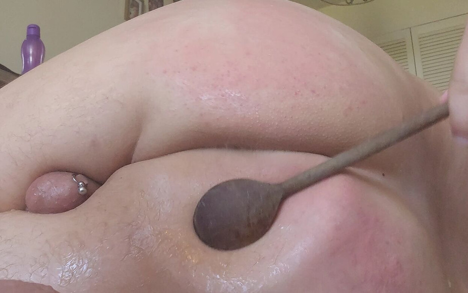 Slow motion spanking with wooden spoon while covered in lube. Some ball spanking in 2nd half.