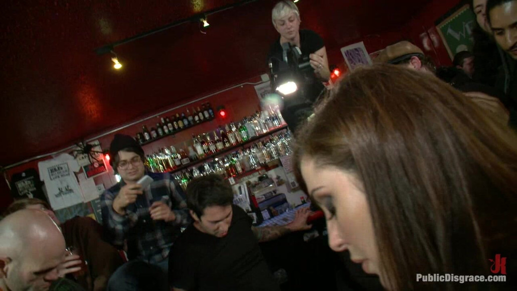 This Disgrace shoot is both EPIC and AWESOME! If more humiliation is what you want, more humiliation is what you get in this week's update. Within minutes of entering the bar our little whore is covered in spit struggling for air in predicament bondage, and pushed to the ground to lick dirty shoes clean. Lots of involvement from bar goers, and just an all around amazing shoot!