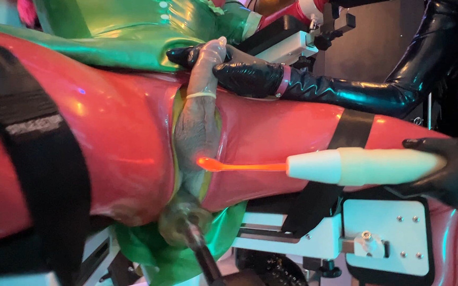 Poor Rubber Sissy now has the pleasure of being freed from her chastity so that all 3 ladies can extensively deal with her puny little cock which could also be described as a mega mean CBT while the fuck machine mercilessly penetrates her ass.