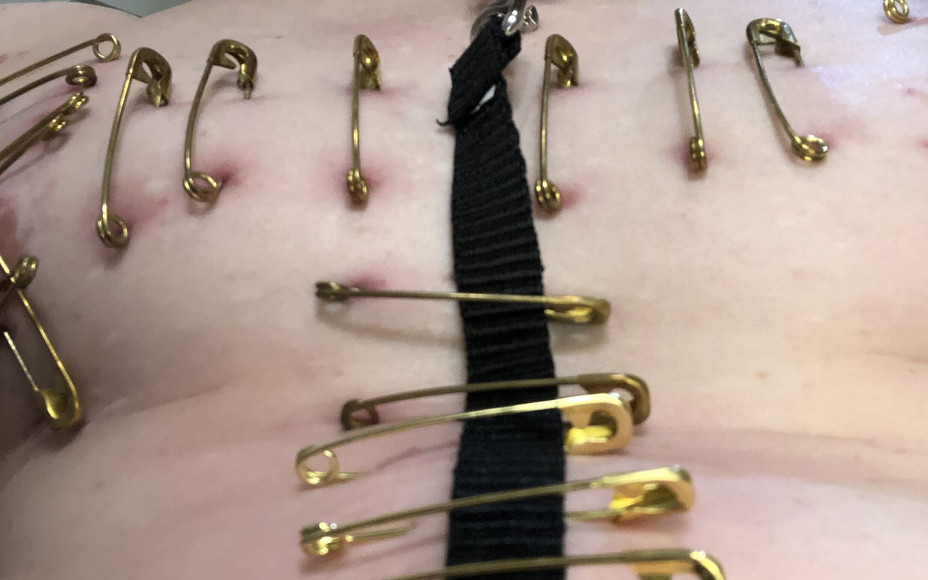 Wheelchair bound submissive with over 20 piercings. Nipples, chest, belly, penis, and balls pierced. Ordered to leave in for a set. Some CBT.