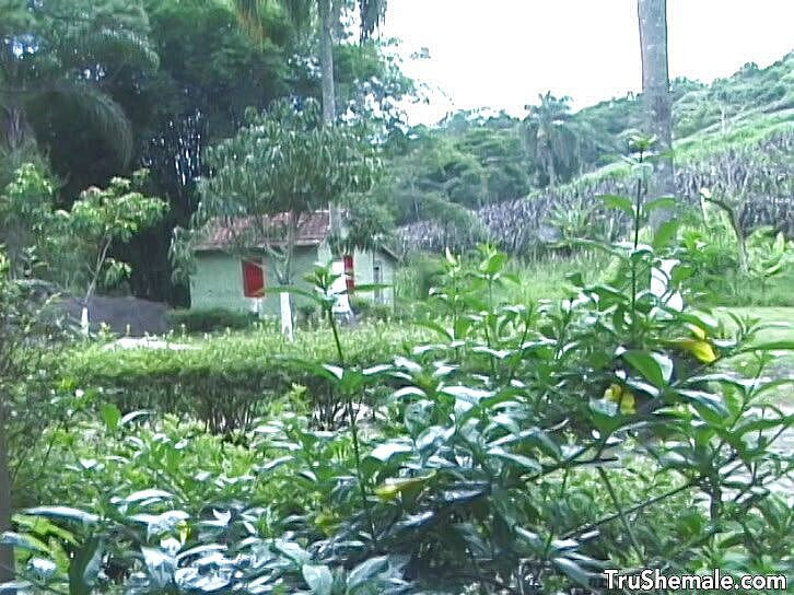 Gorgeous blonde shemale strokes her small dick as her lover passionately reams her asshole on the patio.