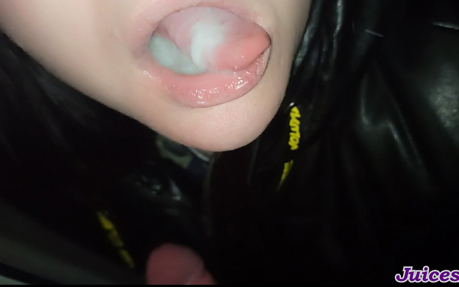 She gladly give a blowjob in the middle of the road in winter. After sucking, she swallowed a mouthful of cum. This girl really loves sucking cocks and swallowing cum.