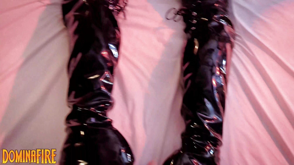 Asian Dominatrix dominafire playing her latex bondage slave sissy locked in chastity cage