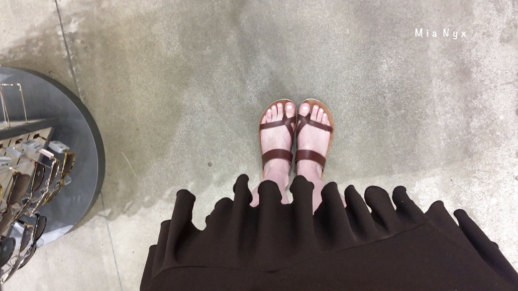Saya memamerkan kaki saya tanpa kaki, dengan kaus kaki putih, sepatu kenekaan cokelat, wedges/ tumit cokelat, dan dalam sandal cokelat saat berbelanja, makan malam di restoran, di lobi hotel, di metro, dan berjalan-jalan di luar ruangan.
