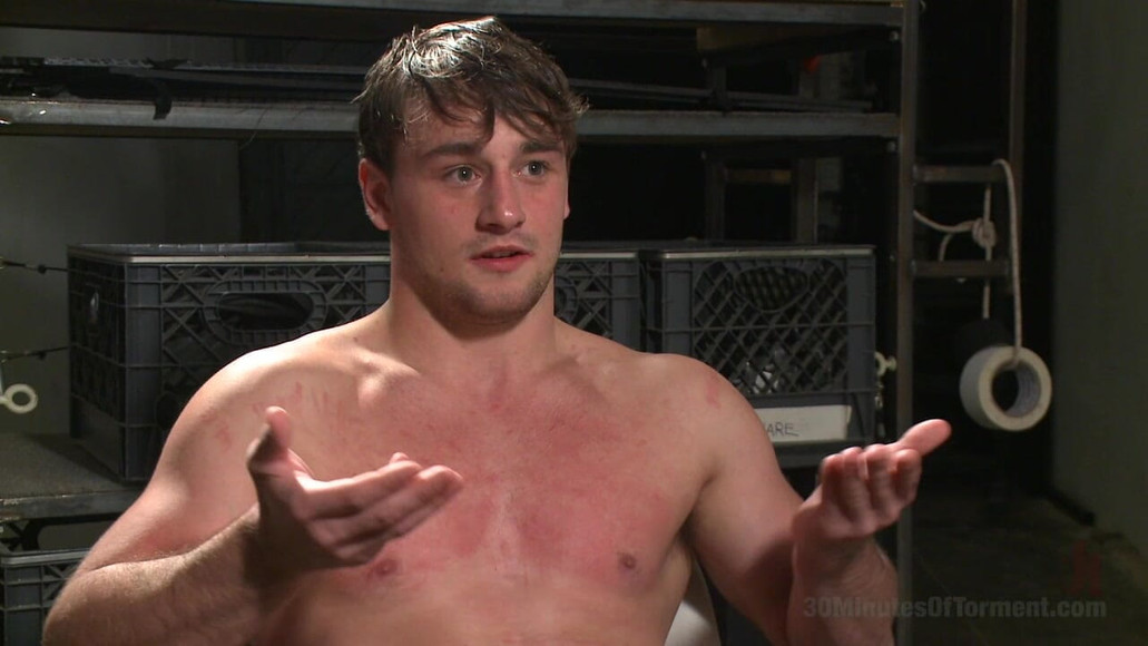 The Pit - Hot bi stud Scott Harbor is pretty brand new to BDSM, but this slut is eager to dive into 30 Minutes of Torment and push his limits to the max. He starts his first challenge in the pit where he’s warmed up with the flogger before feeling the sharp sting of the cat-o-nine tails. Scott is then inverted in the air, struggling in his bondage as he’s mercilessly beaten with the flog. - The Electric Chair - Bound tightly in the electric chair, Scott has electrodes down his thighs with an electric butt plug shoved up his ass. His cock is rock hard as he endures the electricity pulsing through his hole for the very first time. - The Water Station - Now that Scott has made it to his final challenge, he’s chained to the wall with clothespins all across his torso and on his tender balls. Water sprays against the clothespins pinching tightly on his skin before Scott gets blasted in the face. After three intense stations, Scott’s challenged to blow his load from his aching cock.