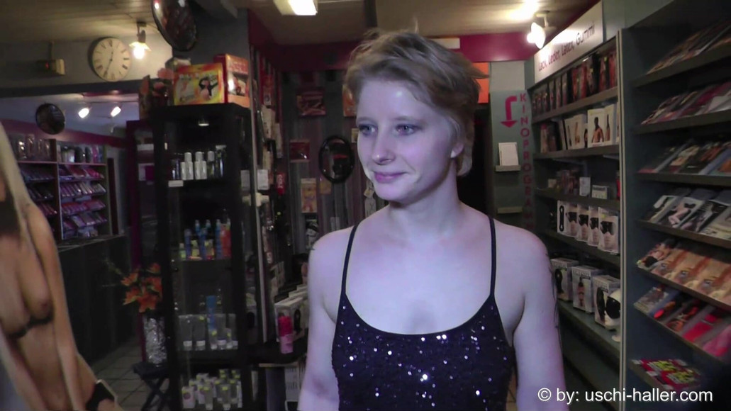 Blonde MILF Sonja Sweet giving a blowjob in the german porn cinema Rocky Sexshop in Aachen