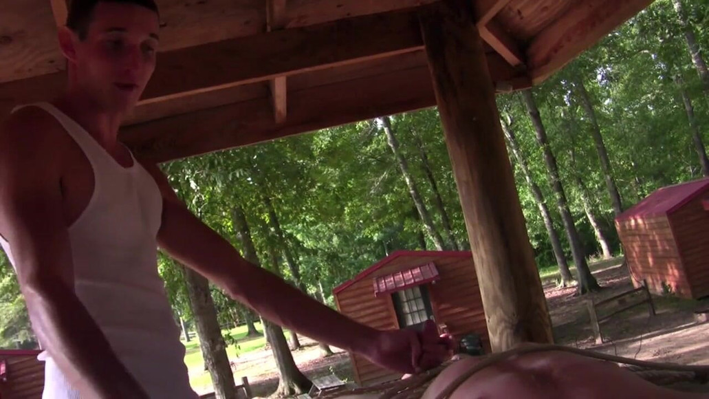 Troy and his ‘masseur’, DJ, want to expand their massage environments to make things more exciting. Much to Troy’s surprise, DJ enjoys bondage experimentation with some of his clients. Before Troy even has a chance to object, he finds himself bound with rope to a wooden table in a tree stand. DJ has every intention of toying with Troy, including stroking his long, hard cock. DJ decides to leave for a bit and take care of some other things, leaving Troy helplessly bound and butt-naked in the middle of the forest. Troy gets worried when he leaves, but DJ soon returns to tease him with promises of hits on the cigarette he is smoking. DJ gives Troy the option of a cigarette or continuation of the cock massage. In reality, DJ knows Troy has no control, and without even waiting for an answer, he continues to jack Troy’s dick. Next Week: More stroking and teasing of the helpless Troy.