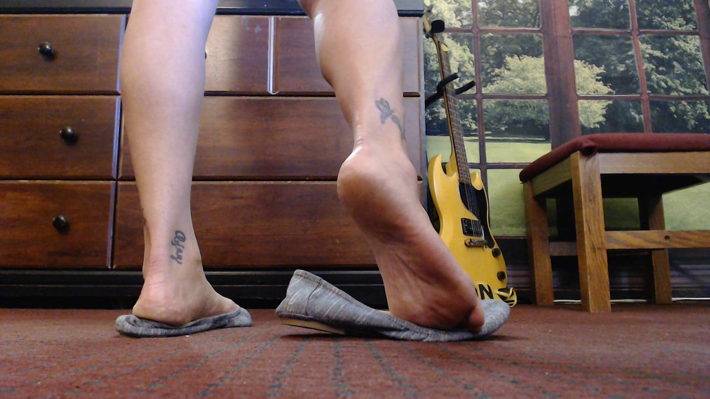 Barefoot inside gray curl style gray ballet flats. Calves legs feet and ankles in view. Natural show play while I am doing make up