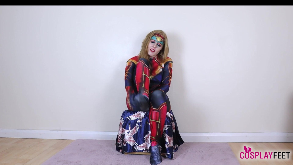 Stunningly beautiful Aurora Phoenix exudes sexiness and seductive vibes in a superhero costume. The smoking-hot babe looks sexier than ever as she flaunts her gorgeous body in a full Captain Marvel costume that complements her beautiful ginger locks and emphasizes her sensational curves. The stunning hottie seductively runs her hands on her long, shapely legs, puts her feet on a footstool, takes off her costume and lures you with her sexy feet. She then shows off her perfect butt in a tiny thong and takes off her bra.