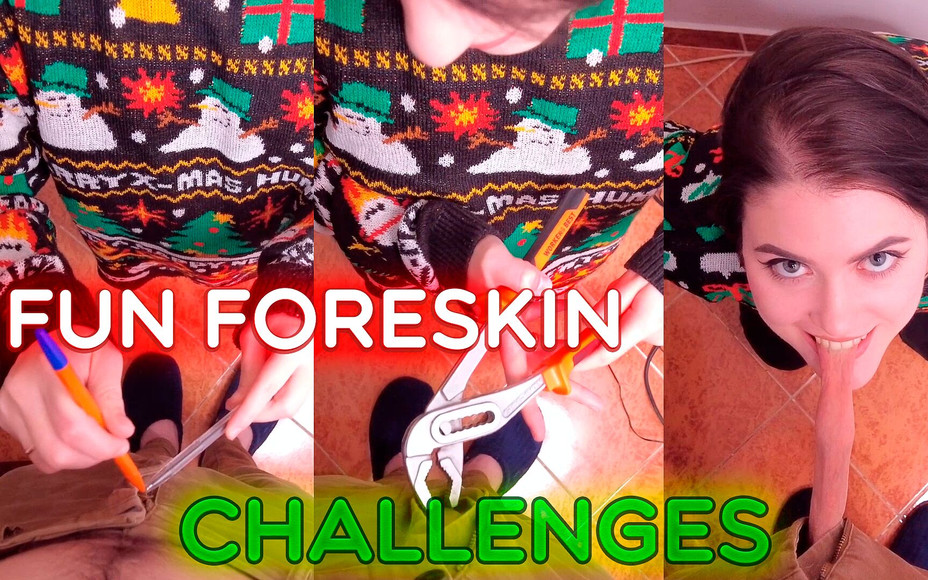 In this fun 5-minute challenge Stacy must find various different ways to open his zip up and pull out the flaccid cock without hands touching. Every time the cock is out Stacy pulls his foreskin with a powerfull bite, then he close his zip again and she restart with another object until time end.