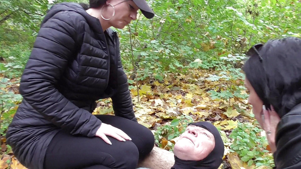 Living Spittoon for the Snotgirls! Old Grand Paps Tomi is used by the two sadistic girlfriends Mistress Ronja and Lady Ines in the forest as a living handkerchief and spittoon. Tomi lying with his head on a tree trunk has to accept with open mouth what the two cruel sadists have for him: Lots of spit and grindiest snot! From both sides, the two Assi-Doms heartily spit his throat towards him.