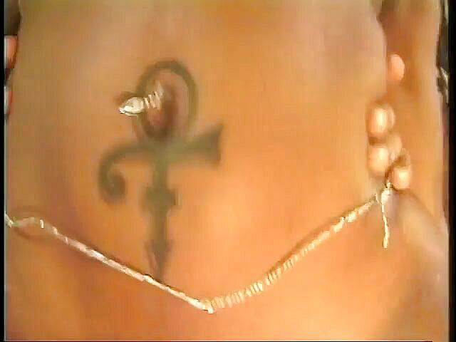 Awek si rambut coklat dengan tatu membongkok untuk mengambil batang black hunk