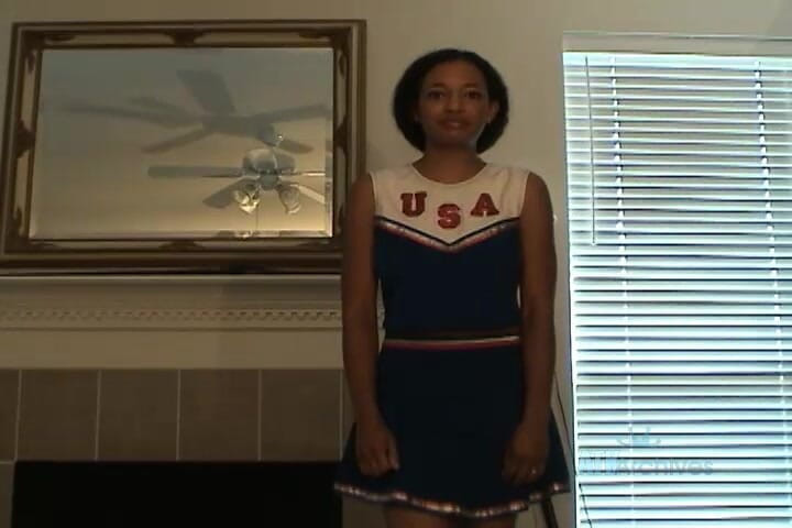 Sexy black babe Grace teases in her cheerleader uniform stripping and rubbing her hairy pussy