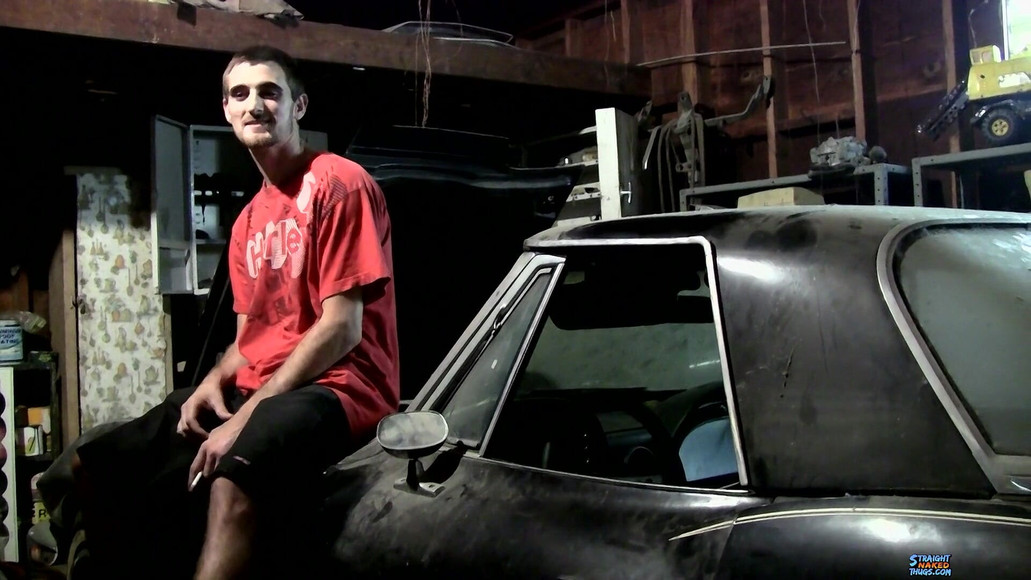 Duke is a hot and always horny straight guy who doesn't care who might be around when he needs to jack on his big dick and shoot a cum load. He's out in the garage with us when the urge to stroke takes over and he reveals his big cock. Stripping down he really gets to work on his length, leaning back on the hood of his ride to splash his cum out over himself!