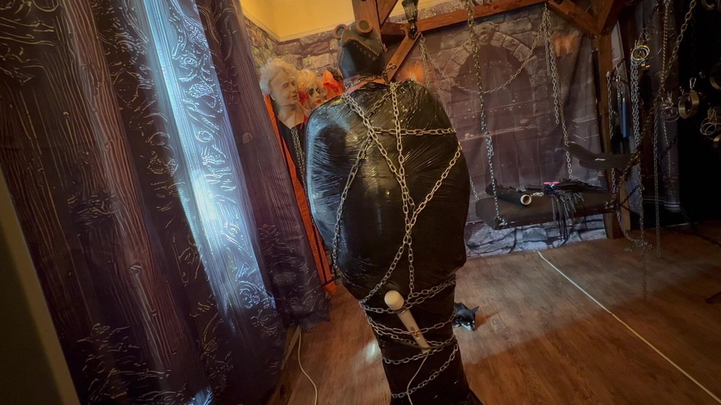 Being secured to the post with chain and pallet wrap. With a nice treat of a wand secured on his cock, for some lovely orgasms. all to keep me a mused while I edit more content!
