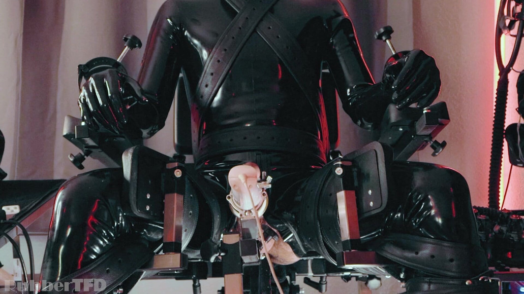 So Pup Devious volunteered to be a test subject in the drone station, trying to get used to the bondage chair and the fucking machine before completely encased in full rubber with more machines!