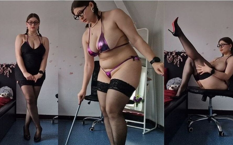Babam ona kıyafetimi gösterip önce odayı temizleyene kadar randevuma ayrılamayacağımı söyledi... İşte buradayım, sıkı siyah bir abiye elbisesi, çoraplar, topuklu ayakkabılar ve en küçük mikro bikinimin altındayım. Videonun yarısı için temizlik yaparken eğiliyorum, poz veriyorum ve azdırıyorum, babamın her açıyı görmesini sağlıyorum. Sonra elbisemi çıkarıyorum, göğüslerim bikiniden dökülüyor ve sandalyede bitiyor - sadece onun için bacaklarımı yalıyorum ve açıyorum. Babamı randevuma çıkmama izin vermeyecek kadar gururlandırdım mı?