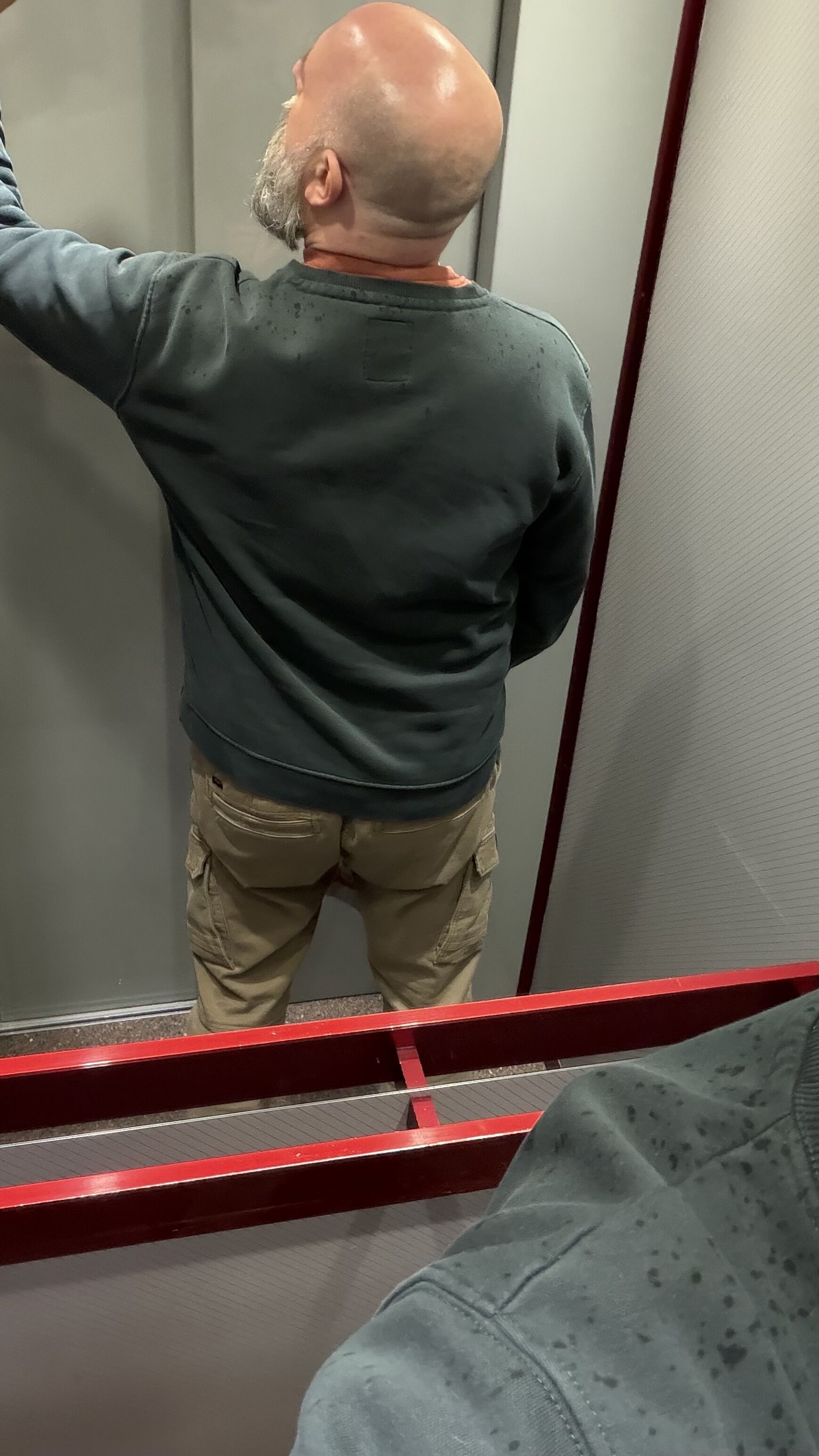 Another hot bathroom jackoff! Hairy German Bear wearing heavy Metal ballstretchers, spreading his sexy legs wide open, huffing deep, showing off feet and unloads!