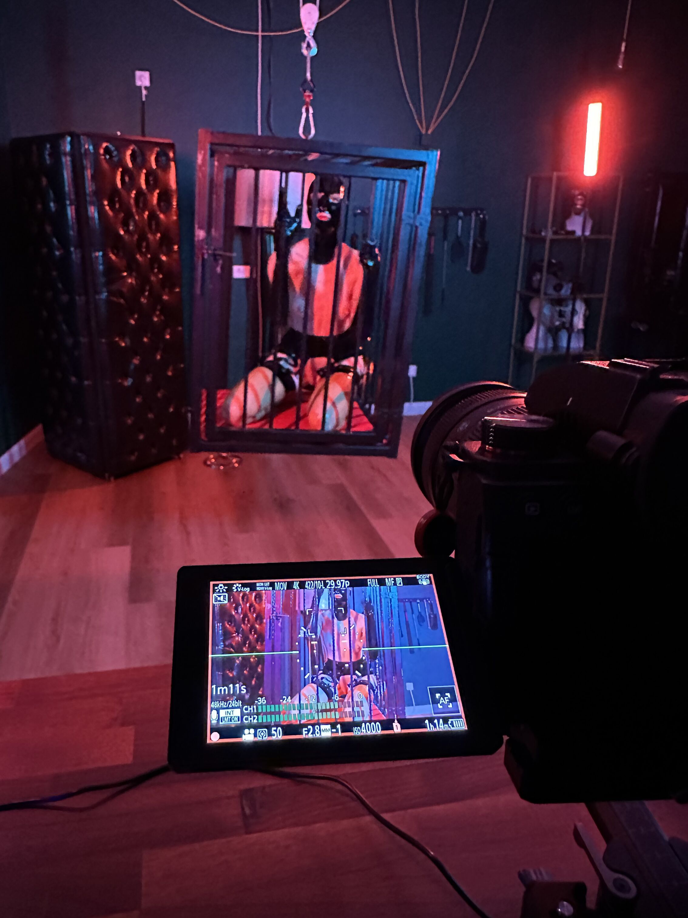 Since the slave's arms are tied behind his back, he has no choice but to obey the mistresses' instructions. After he had to kiss and lick her boots, she ordered him to lick the slave who was tied to a St. Andrew's cross. After the slave's nipples have been played with by the dominatrixes, they fist the tied slave's pussy. Finally, they let the slave fuck the still dripping slave.