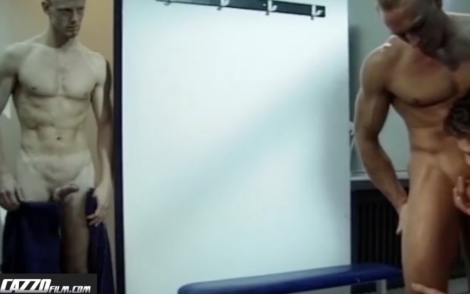 A young bisexual boy having a shower at the gym spots out a dude giving a blow job to a huge gay dick in the locker room. He joins the couple for a gay threesome.