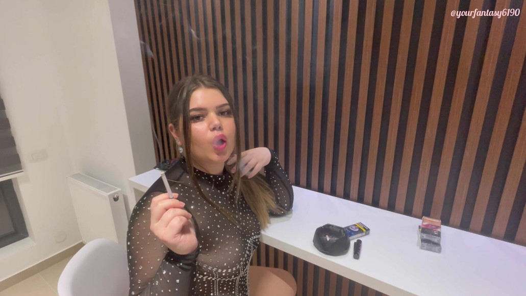 I am super shy and enjoy smoking so much. I wear a sexy black body. I light the cigarette and start to get more confident little by little. I start to make smoke rings and blow the smoke in your face.