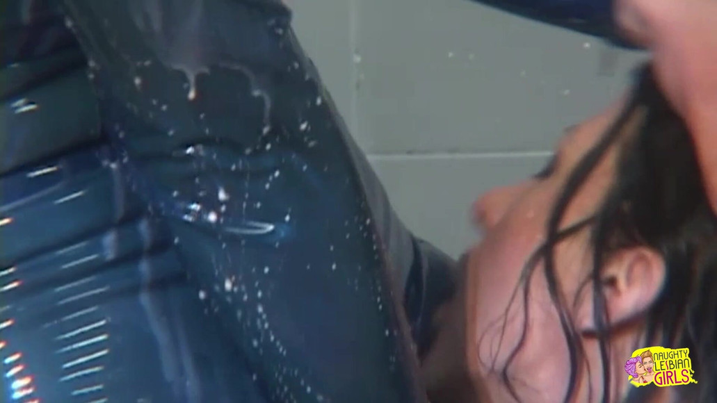 The lesbian gets rammed by sex toys after taking a shower with the brunette clad in latex.