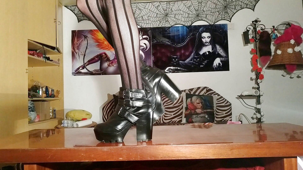 Here is one my favourite short boot. This short boots very comfortable and sexy. It has flat toe-cap, but its heavier than it looks like, so its devastating when has come for a good ball busting. Im wearing only a pantyhose with it, nothing more. ;)