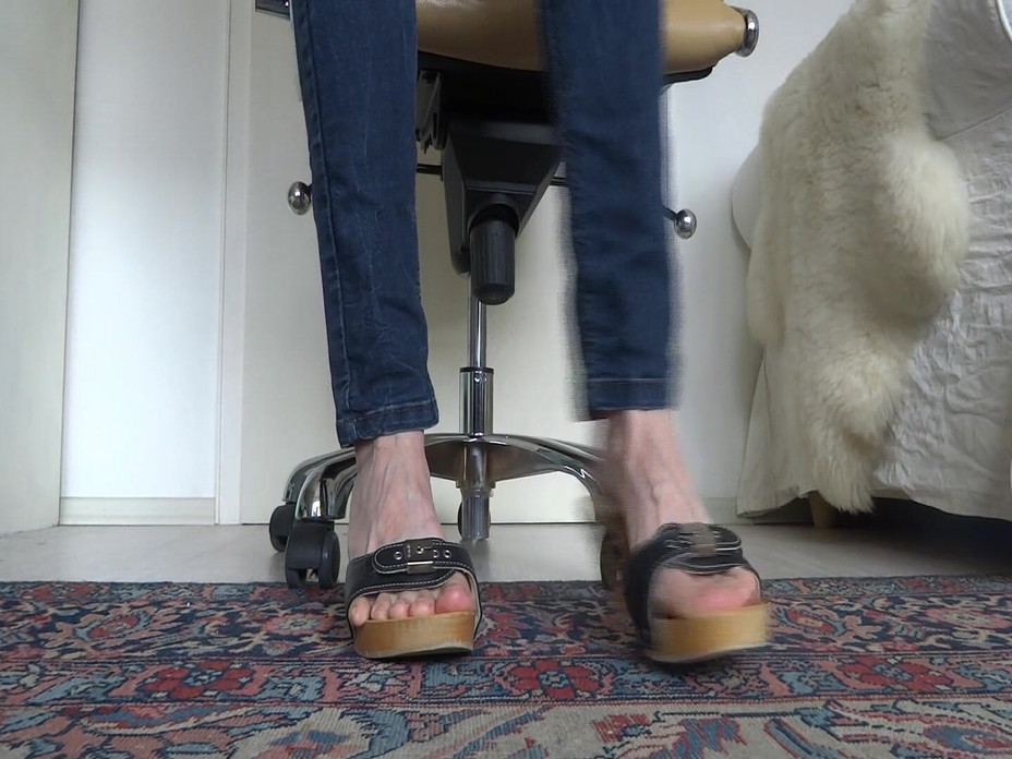Today I show you my wooden mules in beautiful posing and close-ups. My toenails are all natural. I sit or stand in beautiful poses. I dip and dangle. I'm wearing dark blue jeans to match the mules. Have fun with my mules show!