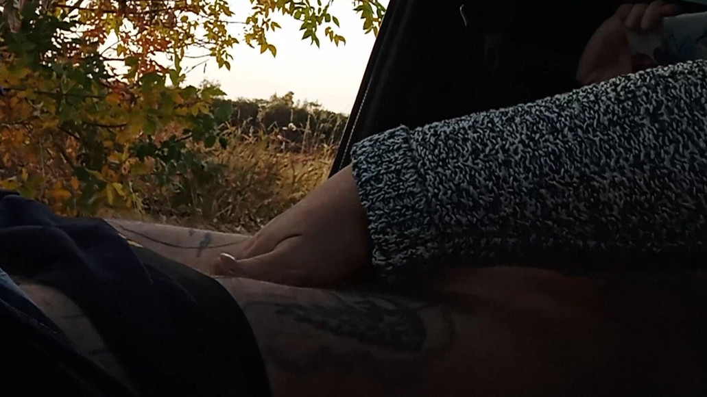 My wife jerks off my dick in the car in nature close up