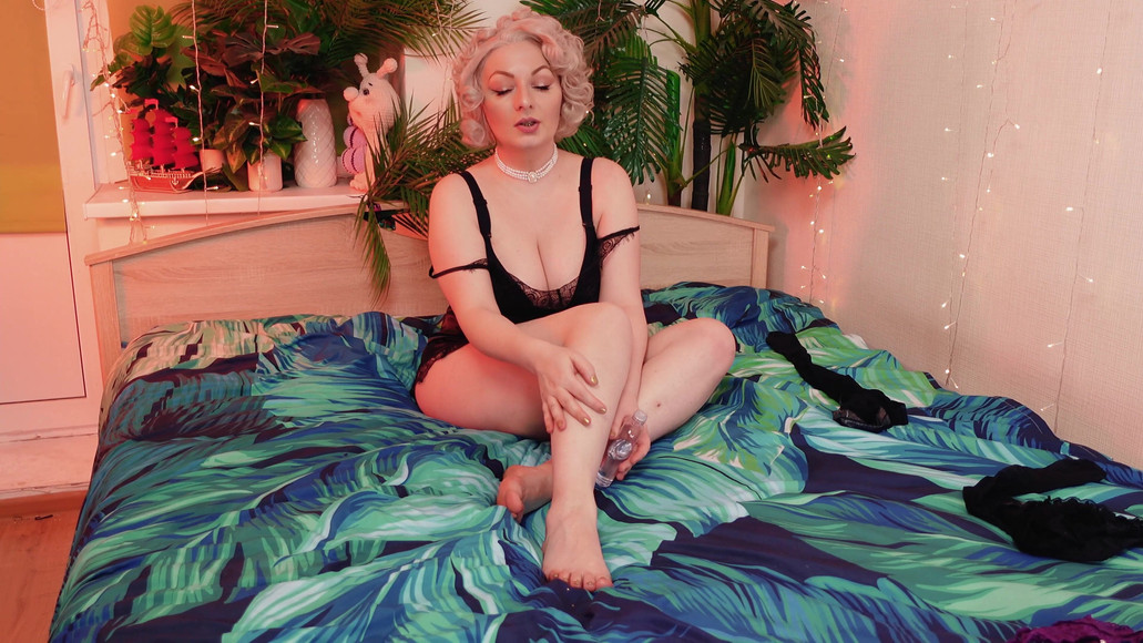 sexy MILF teasing by legs in black nylon stockings and also barefoot: foot fetish video Arya Grander
