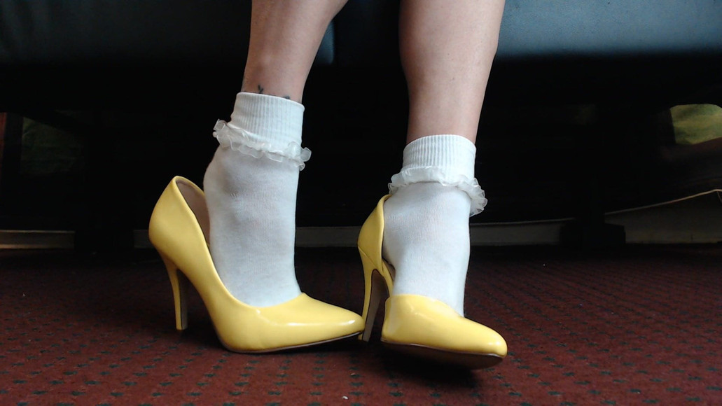 Adorable fold over ruffled socks close up in yellow high heels. Natural shoe play dipping heel slap and slide ins.