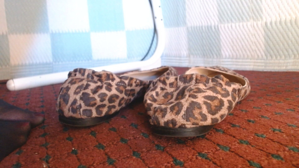 Leopard print curled back ballet flats. Nice and closeup. I have on black nylon pantyhose. I dip and play in and mostly on my ballet flats. You can view inside them as I move around naturally shoeplaying while i work above at my desk.