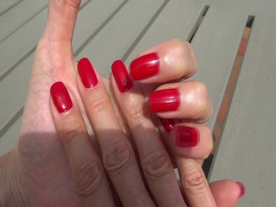 Well, do you like that too? Red fingernails, yes they always look good. Here is a red fingernail clip today. I just move my hands and show them to you. Take a good look so you don't miss anything! I'm not talking in the clip, I just want you to focus on the nails. Natural nails painted red, no plastic!