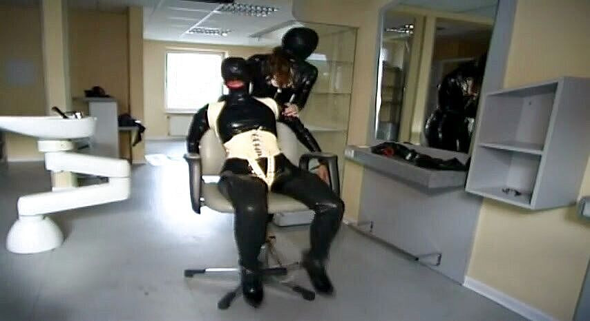 Lesbian fetish girls latex dressed in a hair salon while the photographer takes pictures of them.