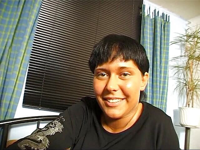 Brunette chick with big ass blows hard cock at the casting and rubs her wet pussy before gets jizzed on her nice tits.